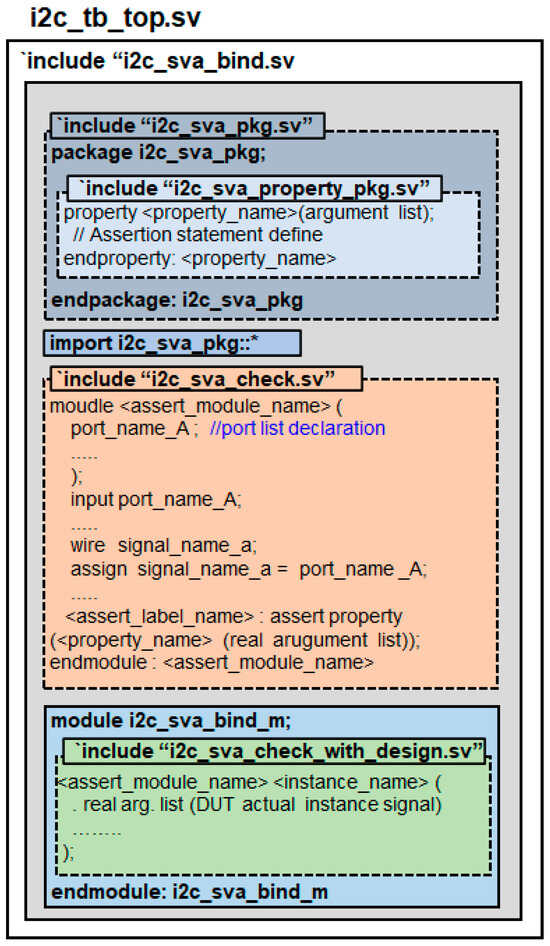 Previous research has introduced UVM-based verification implementations for digital logic and I2C module verification [14,15,16,17,18,19,20,21]. In this study, we propose a reusable ABV verification environment using SVA for verifying the key functionalities of the I2C protocol. Instead of utilizing a UVM-based verification framework, we design an I2C module using Verilog-HDL for low-speed serial communication and validate the design through an SVA-based ABV verification framework implemented using Cadence Xcelium 23.09. The proposed verification environment enables comprehensive verification of the core functionalities of the I2C protocol while also being adaptable to UVM verification environments, thereby enhancing the diversity and applicability of the verification process.