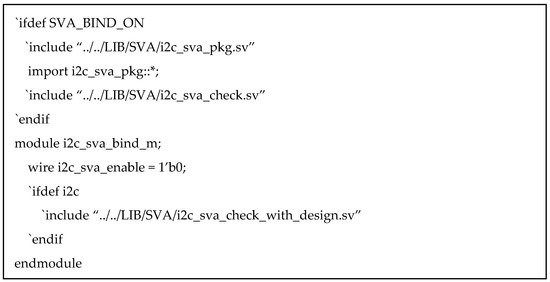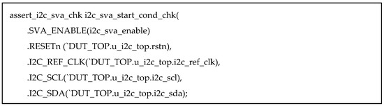 Figure 14. Snippet of the code structure from i2c_sva_check_with_design.sv.Connects the reusable assertion module to the actual DUT via signal mapping and bind, allowing non-intrusive verification without modifying RTL.