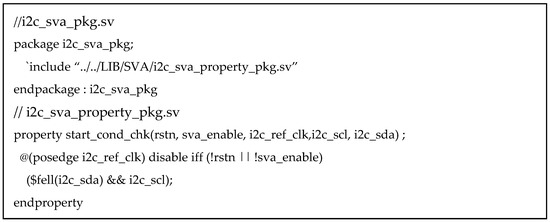Figure 11. Snippet of the code structure from i2c_sva_bind.sv.The central integration file that includes packages and modules required for property definition, evaluation, and binding. - [i2c_sva_pkg.sv, i2c_sva_property_pkg.sv] (Figure 12):