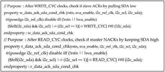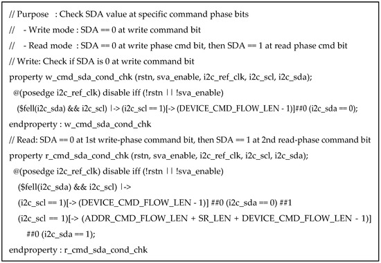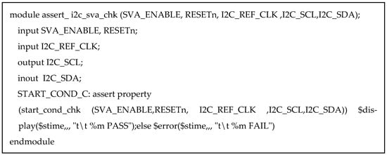 In today’s semiconductor verification field, SystemVerilog Assertions (SVAs) are one of the most important methodologies for functional verification. A representative verification technique is Universal Verification Methodology (UVM)-based verification, which utilizes a SystemVerilog class library. On the other hand, Assertion-Based Verification (ABV) using SVA allows hardware designs to be verified without requiring knowledge of SystemVerilog’s Object-Oriented Programming (OOP) concepts or UVM. Its syntax is intuitive and concise, enabling rapid detection of RTL (Register Transfer Level) bugs during the design and verification phases. This methodology significantly enhances productivity by drastically reducing the time required for semiconductor development. This paper proposes an ABV verification environment using SVA that is reusable in other verification environments for verifying the main functions of the Inter-Integrated Circuit (I2C), one of the serial synchronous communication protocols. Finally, through the development of the RTL design and simulation of the core functionalities of I2C, the key characteristics of I2C were verified using ABV with SVA.