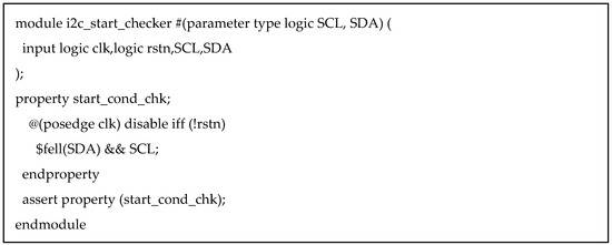 Figure 15. Parameterized assertion module for START condition check.Assertions can be encapsulated within parameterized modules that accept signal bindings as arguments. This enables a single assertion module to support multiple DUTs with varying signal names. - Interface-Based Encapsulation (Figure 16):