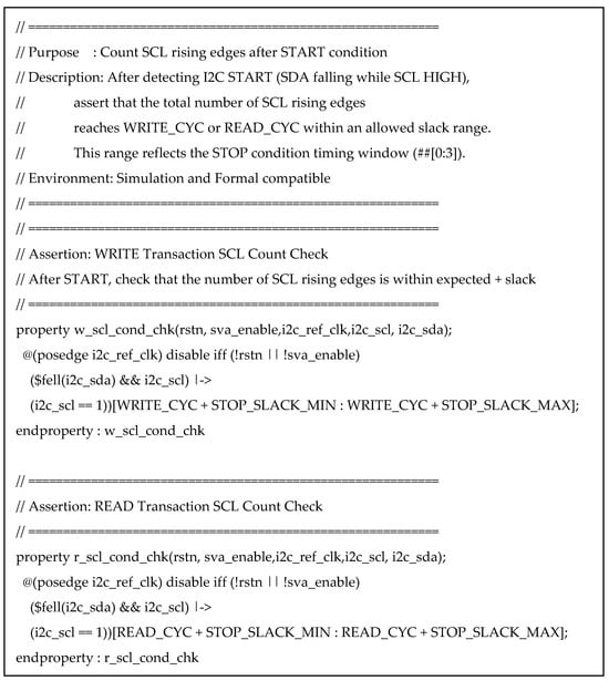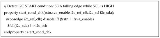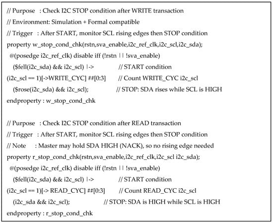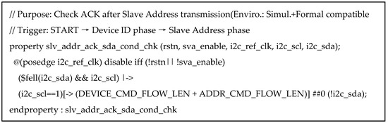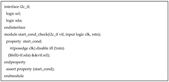 These studies also highlight that ABV can be integrated with simulation- and formal-based flows to improve bug detection and timing property validation without requiring heavy testbench infrastructure. Although ABV is also based on SystemVerilog, it does not require prior knowledge of OOP, class concepts, or UVM. Instead, it enables straightforward verification of the target design’s functionalities and protocols in a more direct manner [7]. This makes ABV particularly effective for verifying serial synchronous communication protocols such as Inter-Integrated Circuit (I2C). Notably, SVA’s concurrent assertion mechanism significantly enhances verification efficiency. Furthermore, ABV provides high portability and reusability, making it applicable to various verification environments.