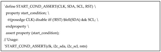 Figure 17. Macro-based START condition check using preprocessor definitions.SystemVerilog macros (define) allow assertion patterns to be reused inline. This is helpful for repeating standard protocol rules across modules.
