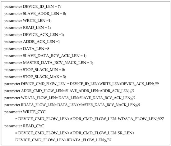 - Kappaganthu, L.M.; Prakash, M.D. I2C Protocol and Its Clock Stretching Verification using System Verilog and UVM. In Proceedings of the 2017 International Conference on Inventive Communication and Computational Technologies (ICICCT), Coimbatore, India, 10–11 March 2017; pp. 478–480. [Google Scholar]
