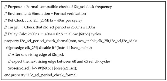 This paper is structured as follows. Section 2 introduces the architecture and operational principles of I2C, which serves as the primary subject of design and verification in this study. Section 3 presents the specifications, design, and RTL simulation results of the I2C module implemented in Verilog-HDL. Section 4 provides an overview of SVA and ABV, along with a detailed explanation of the ABV testbench architecture utilizing SVA for I2C verification. It also introduces assertion reuse and generalization techniques in Section 4.4 and compares ABV with UVM-based verification environments in Section 4.5. Section 5 discusses the experimental results of the proposed methodology in verifying key I2C functionalities. In particular, each assertion was generalized for reuse in both simulation and formal verification environments. All pass and fail cases were analyzed, and representative scenarios are visualized through timing diagrams. Finally, Section 6 presents the conclusions of this study.