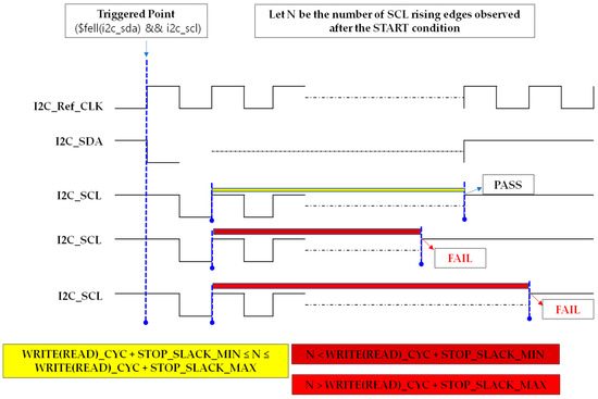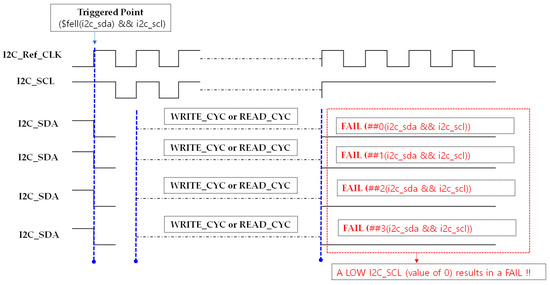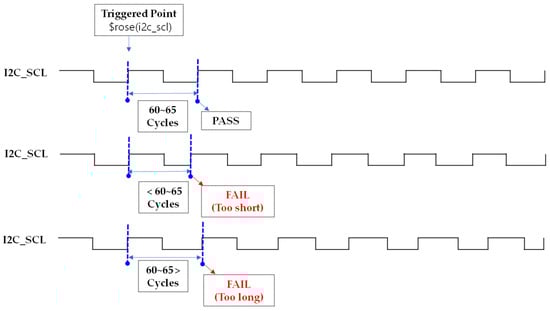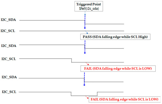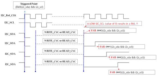 The remaining Case 3 and Case 4 represent situations where either the number of SCL HIGH pulses is less than or greater than expected, or an ACK (i2c_sda == 0) does occur but not at the expected timing. These cases do not satisfy the assertion’s condition and are also evaluated as FAIL, but they are only described in text in this paper without visual illustrations.
