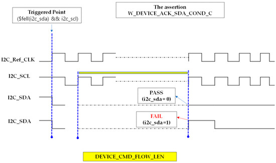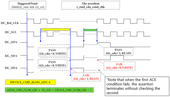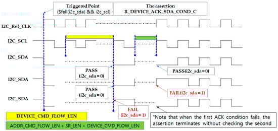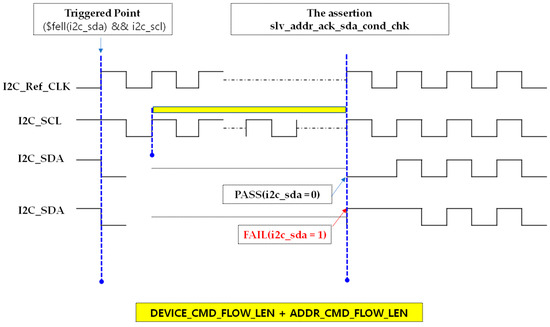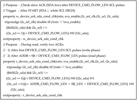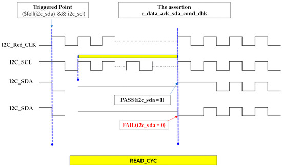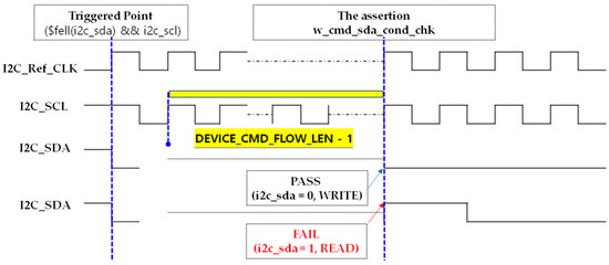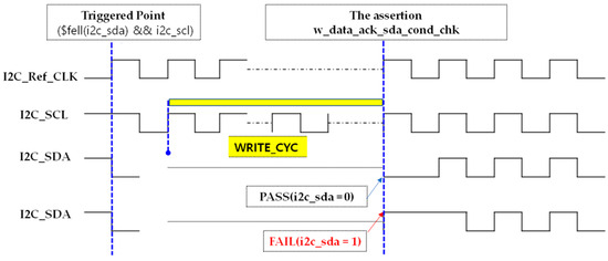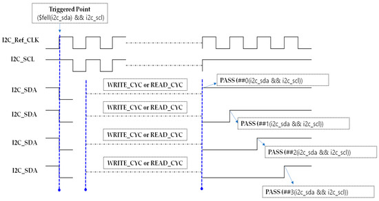The slv_addr_ack_sda_cond_chk property verifies that, after the slave address phase in both Write and Read operations, the device correctly acknowledges by pulling the SDA line low. Triggered by the START condition, the assertion counts DEVICE_CMD_FLOW_LEN + ADDR_CMD_FLOW_LEN SCL rising edges, covering the initial Device ID phase and the slave address transmission. It then checks for an ACK by confirming that SDA is driven low on the next cycle. This assertion ensures that the transmitted slave address has been properly received and acknowledged before proceeding with internal register access or data transfer. Figure 38 shows the assertion code for detecting slave address acknowledgment, and Figure 39 illustrates the waveform behavior of this check. The assertion SLV_ADDR_ACK_SDA_COND_C can be classified into four cases. Among these, the representative PASS (Case 1) and FAIL (Case 2) scenarios are illustrated in Figure 40.