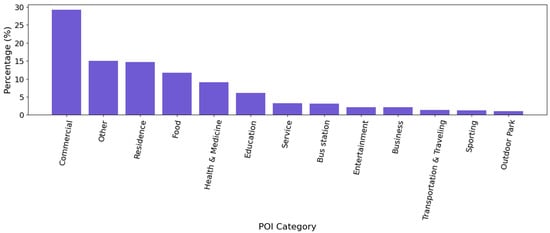 To understand the spatial patterns of urban activity, we analyzed how the density of POIs around bus stops in Ulaanbaatar influences passenger flow to optimize transit networks. The dataset contains POIs across Ulaanbaatar, each labeled with diverse textual information. To understand the distribution of top categories, we classify the textual metadata of POIs into 13 high-level categories, as described in [14], using LLM as gpt-4o-mini. The distribution POI categories are shown in Figure 1, where the x-axis represents the POI category, and the y-axis shows its percentage share among all POIs. This indicates that urban activity is heavily service-oriented. The commercial category has the highest representation, accounting for nearly 30% of all POIs. This is followed by other, residence, and food, each making up a significant portion. Categories like health and medicine, education, and service also hold noticeable shares, while bus stations, entertainment, and business contribute smaller percentages. The least represented categories include transportation and traveling, sporting, and outdoor parks. Since we collected all bus stations separately, we excluded the bus stations from POIs.