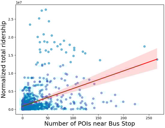 Correlation between density of POIs and total ridership at bus stations. Blue dots represent bus stations, and the red line indicates the correlation line between them.