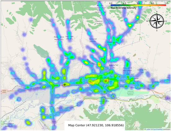 By fusing the above-mentioned data, we capture both the supply of opportunities (spatial distribution of shops, schools, clinics, etc.) and the mobility infrastructure enabling access (sidewalk and road connectivity, transit routes and usage). We further employ machine learning—in particular, a deep learning model—to link urban activity patterns with transit demand [12,13]. Our analysis reveals a moderate-to-strong positive correlation between public transit ridership and the density of nearby POIs. We used our proposed spatial optimization approach, Quad-Bus, to evaluate 20 min city metrics. We improve public transport station placement in a case study of Ulaanbaatar and compare the accessibility outcomes (e.g., walking distance to transit, coverage of amenities) before and after the proposed bus stop allocations. This approach iteratively hones in on high-need areas: it subdivides the urban space until each sub area [14] reaches a threshold of manageable size or homogeneity, and then recommends new bus stop locations to fill accessibility voids. Such a strategy ensures that densely populated or amenity-rich areas receive appropriately placed transit stops, while avoiding the over-concentration of resources in already well-served zones. The proposed framework directly addresses the limitations of walkability/transit indices by accounting for real-world ridership patterns and the heterogeneous structure of Ulaanbaatar city. The insights gained help shape urban development strategies—ranging from optimizing bus stop placements and improving pedestrian infrastructure to aligning land use planning with transit networks—to guide Ulaanbaatar toward a more accessible, equitable, and sustainable 20 min city model that meets the needs of all its residents.