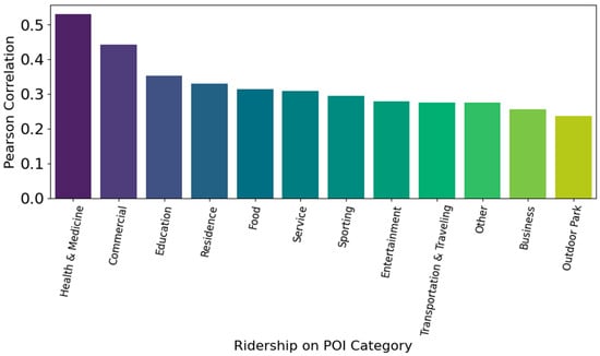 The red and yellow regions indicate the highest concentration of activity, while green and blue areas show lower activity levels. We compare the overlap to identify how many high-ridership areas match with high-POI-density locations. To compare the two clusters, we calculate the centroids for each of the clusters. We convert all geographical coordinates from degrees into radians. This step is necessary because the Haversine Formula described in Formula 1, which is used to calculate distances between two points on the Earth’s surface, requires input values in radians. To find the nearest ridership cluster for each POI, we identify the ridership centroid with the minimum distance from each POI centroid. We conduct correlation analysis between the number of nearby POIs (by category) and the total ridership at each stop. Specifically, we use Pearson correlation to assess whether the presence of certain types of POIs is associated with higher or lower bus usage. Finally, we visualize the results, using a bar chart in Figure 4 to highlight which POI categories are most strongly correlated with ridership. This allows us to identify areas, such as those with high concentrations of commercial or medical facilities, where POIs may serve as reliable proxies for public transport demand.