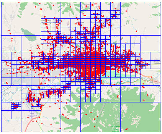 We further analyze optimal bus station allocation, which plays a key role in improving accessibility. Well-placed bus stops reduce travel time, enhance convenience, and encourage public transit use. Strategic planning ensures that stops serve high-demand areas while minimizing redundancy. In urban areas, bus stops are typically spaced between 300 and 500 m apart, ensuring easy access for passengers with a walking distance of 5–10 min. This distance is generally considered optimal for high-density areas, balancing coverage and efficiency [28]. In suburban areas, where population density is lower, bus stops are typically spaced 800 m to 2 km apart. This reduces the number of stops, optimizing the system’s efficiency without compromising service [37]. For express or high-speed routes, bus stops are spaced 2 to 5 km apart. These routes are designed to minimize travel time, often running on highways or major corridors with high ridership [28]. In rural areas, where the population is more dispersed, bus stops are generally spaced 5 to 20 km apart, reflecting the longer distances between key locations [38]. To ensure the optimal locations are selected for bus stations, we apply a quadtree partitioning approach, Quad-Bus partitioning using Formula 2 to the outer bounding box of the Ulaanbaatar city with following coordinates:
