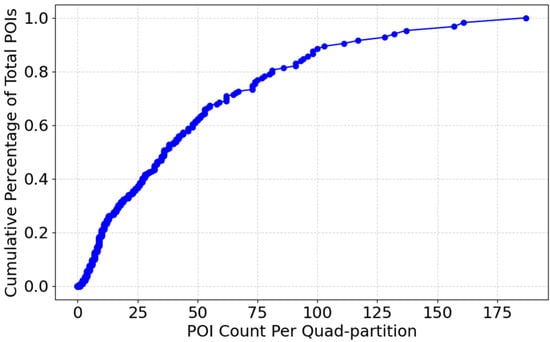 The cumulative distribution plot represented in Figure 6 illustrates how POIs are distributed across various subareas. The x-axis represents the number of POIs per partition, while the y-axis shows the cumulative percentage of total POIs. As the curve progresses, it highlights the density variations in different areas, revealing whether POIs are concentrated in specific locations or evenly spread across the region. A steep initial slope denotes many low-activity partitions, while the flatter tail denotes a few high-activity hubs. At the lower end of the x-axis, the steep incline suggests that a significant number of subregions contain only a small fraction of the total POIs. This indicates that many areas have relatively low activity or sparse development. As we move towards the middle, the curve becomes more gradual, signifying that certain subregions have a moderate and more consistent distribution of POIs. Towards the higher end, the curve flattens, showing that a few high-density areas account for a large portion of the total POIs.