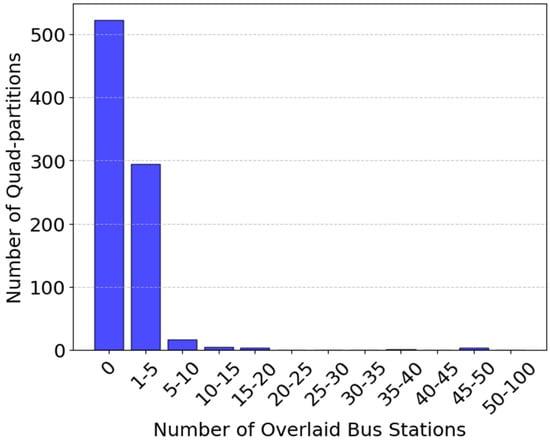 To assess the optimal geographic placement of bus stations based on the distribution density of POIs, we count the number of bus stations located within each subarea (partition) generated by the quadtree. Figure 7 visualizes the spatial distribution of actual bus stations overlaid on the quadtree partitions.