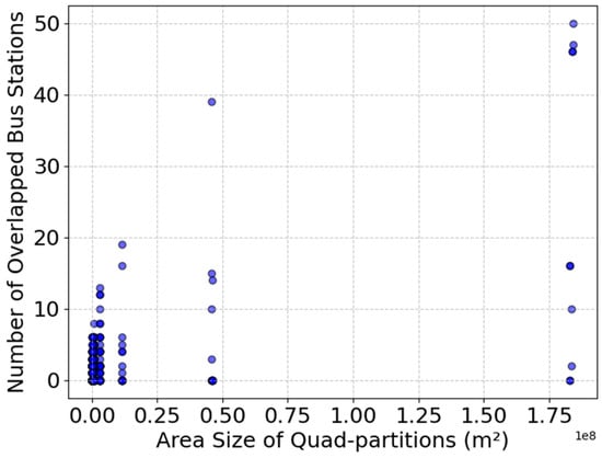 Most partitions (over 500 subareas) have 0 bus stations. This suggests that the high-density activity urban areas have no coverage. A significant number of partitions, approximately 300 subregions, have 1 to 5 bus stations. Very few partitions contain 50+ bus stations. This highlights the uneven distribution of public transport infrastructure between urban and suburban areas, which in turn reduces overall ridership accessibility. Figure 8 visualizes the relationship between quadtree partition size (in square meters) and the number of bus stations, highlighting how station density varies across different partition scales. Interestingly, smaller quadtree partitions contain between 0 and 10 bus stations per subarea. In contrast, larger quadtree partitions tend to encompass more bus stations per subarea, indicating that rural or suburban regions may have an overabundance of bus stations, or that the use of POI data collected from these areas may be insufficient.