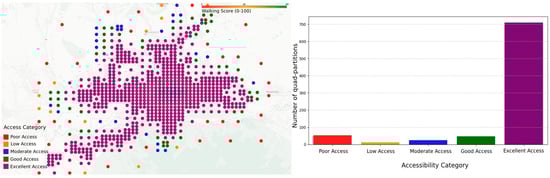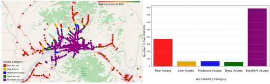 Figure 10 represents the distribution of walking scores for each bus station. The majority of bus stations fall into the “Excellent Access” category. This suggests that many bus stations are well-connected to POIs within a walkable distance. It indicates the need for an efficient urban planning design where public transport hubs are located near essential services (e.g., shopping centers, offices, schools, or healthcare facilities). In contrast, a significant number of bus stations have “Poor Access”. Many bus stations are in areas with limited POIs within walking distance. This could imply poor urban planning, lower density areas, or suburban locations where additional infrastructure is needed. The categories “Low, Moderate, Good” represent transitional areas, meaning some stations provide moderate accessibility but might still need improvements.