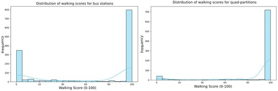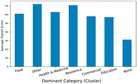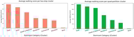Quad partitions benefit campuses and hospital complexes, whose POIs are spread across several adjacent stops. The none category is a mixed category without a dominant aspect. At the bus stop clusters, the food and other clusters are already strong regarding walkability. In contrast, none, residence, and parts of commercial/education are “doubly disadvantaged” zones that would benefit most from either new local amenities or better last-mile connections. Food- and health-dominated cells average Walk Scores ≈ 100 and 92, respectively, while residence and mixed “none” clusters have scores falling below 30, indicating that they have both few amenities and weak transit. Food (walking score ≈ 100)-specific quad partitions, whose 20 min walking catchment is dominated by restaurants, cafés, and grocery shops, score almost the theoretical maximum. Health and medicine (walking score ≈ 92)-specific quad partitions, anchored by hospitals, clinics, or pharmacies, are also highly walkable. Besides medical facilities, these catchments typically contain convenience stores and eateries, boosting the score. Purely residential districts tend to be mono-functional. Housing blocks are plentiful, but ground-floor retail or services are sparse, and so walkability drops.