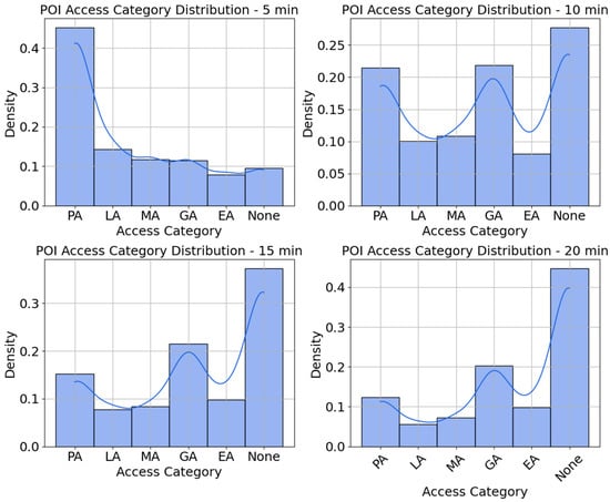 In Figure 13, each panel shows the distribution of walking scores—the raw count of POIs that can be reached from every quad-partition centroid—given a different walking-time threshold (5, 10, 15, and 20 min). The x-axis is the walking score itself; the y-axis is the number of POIs that fall into each score bin. As the walking time increases from 5 min to 20 min, the distribution shifts towards better access categories, with excellent access (EA) becoming the most prominent at the 20 min interval. For shorter intervals (5 and 10 min), the access distribution is skewed toward poor access (PA), meaning that many POIs are not easily accessible in a short walk. However, as the interval increases, the access categories become more balanced, with better access spreading across the dataset. The KDE curve helps in visualizing the smooth distribution of POIs across the categories, indicating areas of higher and lower concentrations of accessible POIs. In the 10 min walking radius, the access distribution becomes more spread out, with poor access (PA) still having a prominent peak, but Low Access (LA) starts to show higher counts compared to the 5 min interval. The 15 min interval sees more balance in the distribution of access categories. Moderate access (MA) starts to show a significant increase, and good access (GA) and excellent access (EA) also begin to appear more prominently. The results highlight the importance of walking distance in determining accessibility to POIs and emphasize the increasing availability of accessible locations as the walking radius expands.