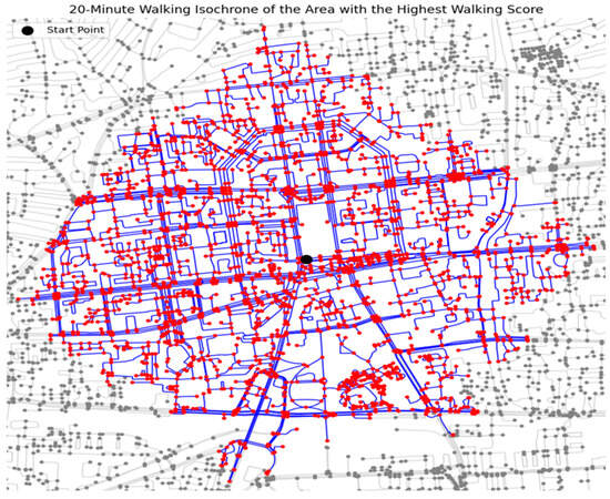 Walking isochrone at the location with the highest walking score. The figure displays the full road network in gray, overlays the 20-minute isochrone in blue, and marks the starting point in red. The blue lines represent the portion of the street network that is walkable within the 20-minute timeframe.