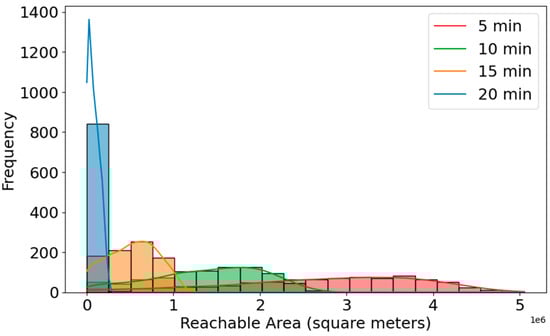 Figure 16 illustrates distribution of reachable areas (walking isochrone) across quad-partition centroids, for different time intervals. We use Universal Transverse Mercator (UTM) projection to obtain accurate isochrone areas in square meters. The X-axis is a reachable area in square meters. The Y-axis is frequency. A large number of centroids have small reachable areas, even when considering 20 min of walking. This suggests that there is limited connectivity in the pedestrian network or physical/urban barriers (e.g., large blocks, rivers, highways, poor infrastructure). A higher bar means more locations are reachable from an area. Blue (20 min): Many locations have a very small area reachable within 20 min. The distribution is heavily skewed to the left, suggesting the existence of obstacles like road design, natural barriers, or disconnected paths. Orange (15 min) and green (10 min): as walking time decreases, fewer locations have very high accessibility, but the area increases gradually. Red (5 min): Expectedly, this color covers smaller areas, but they are more spread out, suggesting that some locations are highly walkable, even in just 5 min. With 10, 15, and 20 min, the accessible area gradually increases, showing that longer walking times provide access to a wider range of areas, but the frequency decreases as areas grow larger. All distributions are right-skewed—meaning most locations have relatively a low reachable walking area, while a few have very high walkable access. These findings emphasize that while central districts support pedestrian mobility, many outer neighborhoods lack adequate pedestrian infrastructure, reinforcing the need for investment in walkways, street crossings, and urban design improvements.