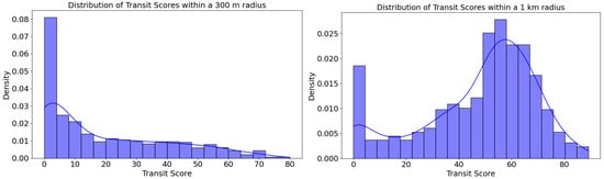 Distribution of transit scores within 300 m and 1 km radii across quad partitions. The blue line represents the density estimation of the histogram.