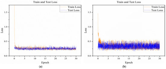 The training parameters are as follows: the epoch number is 30, batch size is 4, and the cross-validation fold is 3. The loss of training on the experimental equipment is shown in Figure 8a, where the loss of both training and testing converges to 0.19, and the final ratio of the number of images of each category to the input model is 0.83:0.82:0.91:1:0.79. In the integration strategy, the employment of hierarchical K-fold cross-validation to select the optimal model combination, in conjunction with the dynamic adjustment of the weights of each model, can prevent overfitting of the integrated model. This means that our network has been adequately trained by data enhancement, Stratified K-Fold cross-validation and Weighted Random Sampler sampling methods on the input data to balance the number of categories and adequately trained.