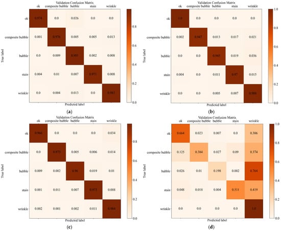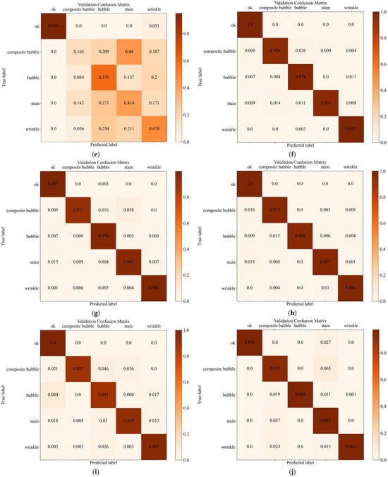 Confusion matrix for different models. (a) Model pre-training migration Faster-RCNN and RetinaNet models integrated network; (b) Faster-RCNN model; (c) RetinaNet model; (d) Fast-RCNN model; (e) integrated model network using category-imbalanced source dataset; (f) regularization factor = 5 × 10−6; (g) regularization factor = 2 × 10−5; (h) NMS threshold = 0.5; (i) NMS threshold = 0.7; (j) batch size = 8; (k) unfreeze backbone network; (l) non-use dropout; (m) non-use pre-trained weights; (n) no replacement of classification and regression layers.