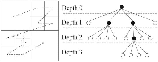 Three-Dimensional HEVC (Three-Dimensional High-Efficiency Video Coding) extends the HEVC standard to jointly compress multi-view texture video and its corresponding depth map, enabling free-viewpoint synthesis and immersive media applications. Its coding framework, illustrated in Figure 1, consists of texture video coding and depth map coding. Texture video retains HEVC’s prediction, transformation, and entropy coding techniques while incorporating inter-view prediction to reduce redundancy through parallax compensation. Depth map coding employs specialized tools to enhance the compression efficiency of geometric edges and smooth regions. Both data types undergo Rate-Distortion Optimization (RDO) for dynamic bitrate allocation, producing a layered bitstream containing texture and depth information. Depth map coding is the key innovation of 3D-HEVC, with the primary challenge being to balance edge accuracy and computational complexity. Depth maps represent the geometric structure of a scene, where minor errors in discontinuous edges (e.g., object boundaries) can cause geometric distortions in synthesized views. Meanwhile, the low entropy of smooth regions (e.g., wall surfaces) necessitates efficient compression. To address these challenges, 3D-HEVC employs two key techniques: Depth Modeling Mode (DMM) and CU quadtree recursive partitioning. The first technique, Depth Modeling Mode (DMM), includes explicit wedge segmentation (DMM1) and implicit region derivation (DMM4), both designed for depth map edge coding. DMM1 segments the Prediction Units (PUs) into two constant-value regions and directly encodes the edge positions, whereas DMM4 minimizes edge encoding redundancy by deriving segmentation boundaries from neighboring pixels. The second technique is the CU partitioning mechanism (illustrated in Figure 2), where the depth map begins with a 64 × 64 Coding Tree Unit (CTU) and is recursively subdivided into 32 × 32, 16 × 16, and 8 × 8 sub-CUs, forming a quadtree structure. The partitioning decision is determined by Rate-Distortion Cost (RD Cost): if the total RD Cost of the subdivided CUs is lower than that of the undivided CUs, recursion continues; otherwise, it terminates. Unlike conventional HEVC, depth map CUs prioritize edge accuracy, meaning object boundary regions are typically subdivided to the smallest granularity (8 × 8), whereas smooth regions tend to form larger CUs (e.g., 64 × 64, without further partitioning).