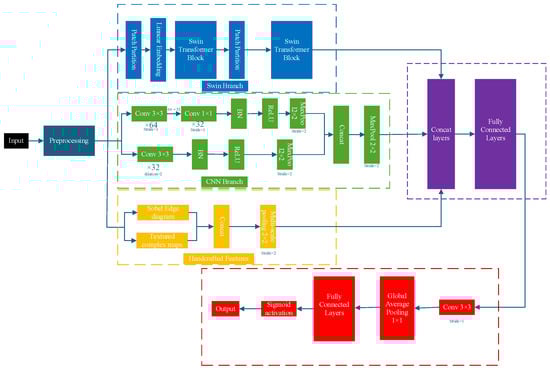This module performs an adaptive fusion of multimodal features using gated networks, with the core mechanism being the dynamic optimization of feature contribution weights based on regional characteristics. Specifically, traditional handcrafted features (edge strength, local variance) are concatenated with global context features extracted by the Swin Transformer and local texture features captured by the CNN. The channel dimensions are aligned using 1 × 1 convolution to form a multimodal fusion base. The concatenated features are fed into a two-layer multilayer perceptron (MLP). The first layer extracts cross-modal interaction information through a 128-dimensional hidden layer, while the second layer generates a spatially adaptive weight matrix using Sigmoid activation. The final step weights and sums the three-channel features, outputting the unified fusion features.