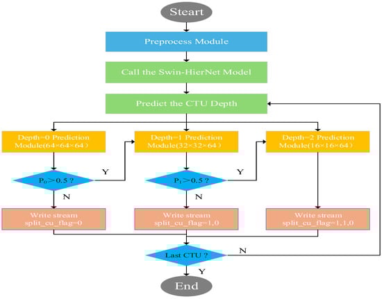From Figure 4, firstly, we preprocess the 3D video that will be read and then call the proposed Swin-HierNet model. Next, we read the CTU to be encoded. Finally, the depth of the CTU partition is used in this model.
