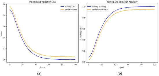 As illustrated in Figure 5a, both training and validation losses demonstrate a consistent downward trend and finally converge to low values, indicating effective minimization of prediction error. Figure 5b shows the accuracy curves, where both training and validation accuracies increase steadily and eventually stabilize at approximately 94.8% and 94.2%, respectively. The close alignment between training and validation curves indicates that the model generalizes well to unseen data and no significant overfitting was observed.