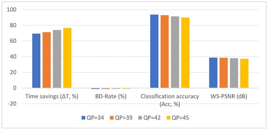 As can be seen from Figure 6 that ΔT increases with higher QP values: when QP increases from 34 to 45, the time-saving rate rises from 69.3% to 76.5%, as the CU division depth typically decreases at higher QP, resulting in more efficient predictions by the model.