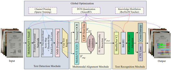 In the multimodal alignment stage, the focus is on the collaborative optimization of visual and textual semantics. The text region images output from the detection stage are processed in two parallel paths: one path uses the lightweight visual Transformer architecture, MobileViT-XXS, to extract global semantic features. Its hybrid CNN-Transformer design, with only 5.6 M parameters, balances the modeling of local details (e.g., stamp edges) and global layout (e.g., table structure). The second path inputs the preliminary recognition results generated by Tesseract OCR into the lightweight CLIP-Text encoder (with parameters compressed to 30 M). This utilizes contrastive learning to align the text embedding with the semantic space of the image. In the feature fusion stage, element-wise summation is used to map the 256-dimensional image features and text features into a 128-dimensional joint semantic space . This mechanism dynamically resolves semantic ambiguities—recovering the misclassified “S” to “5” in OCR, reducing the Character Error Rate (CER) by 1.8%, and significantly improving the reliability of key field recognition.