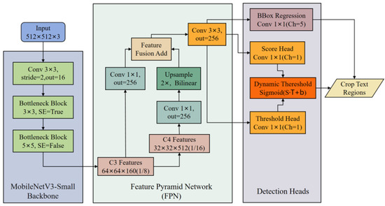The text detection module is the core component of the receipt-like financial document automation recognition system, designed to accurately locate text regions from complex backgrounds, especially in challenging scenarios such as small-sized text, low contrast, and rotated text. This module utilizes an improved MobileNetV3-Small + Feature Pyramid Network (FPN) architecture, combined with dynamic threshold classification and rotated bounding box geometric regression, to achieve an end-to-end optimized design. The text detection module is shown in Figure 2.