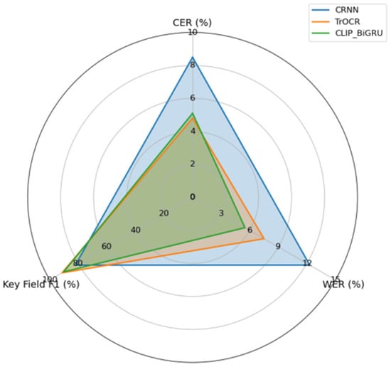 The CLIP–BiGRU framework demonstrates exceptional efficiency and accuracy, making it highly suitable for edge deployment. With a compact model size of just 18 MB and a real-time processing speed of 25 FPS, the system enables seamless operation on low-power devices, ensuring practicality for resource-constrained environments. In terms of performance, the model achieves a Character Error Rate (CER) of 5.1%, closely matching state-of-the-art cloud-based models, while its key field F1 score reaches an impressive 93.14%, highlighting its robust multimodal accuracy. Furthermore, the framework’s cost efficiency surpasses existing solutions by one to two orders of magnitude, offering a highly economical and scalable solution for receipt image automation. This combination of efficiency, accuracy, and cost-effectiveness positions CLIP–BiGRU as a transformative tool for real-world applications in financial automation and beyond.