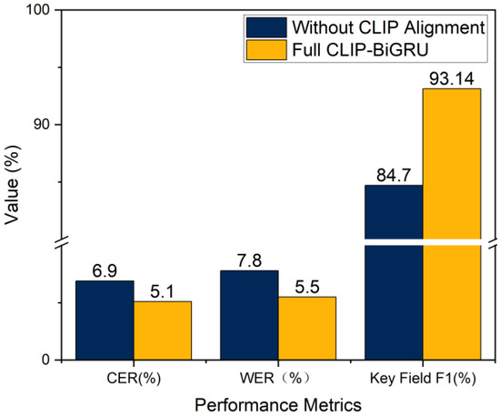 The cross-modal semantic correction dynamically refines OCR results, particularly for ambiguous characters. For instance, the misclassification of “5” as “S” is reduced by 45%, ensuring higher accuracy in character recognition. The contextual awareness enhancement strengthens the semantic consistency between related fields, such as “Amount” and “Total Price”. This improvement not only reduces errors but also boosts the key field F1 score by 5.5 percentage points, demonstrating the framework’s ability to better understand and process complex document structures. Together, these advancements underscore the effectiveness of CLIP–BiGRU in achieving robust and accurate multimodal alignment for receipt image understanding.