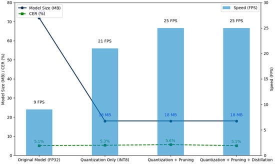 As shown in Figure 10 and Table 14, the model is optimized through quantization, pruning, and distillation. INT8 quantization reduces size by 75% (72 MB→18 MB) with a 0.2% CER increase and 2.3× speedup. Pruning improves speed by 19% (21 FPS→25 FPS), reduces parameters by 32%, and increases CER by 0.5%. Distillation recovers 0.5% CER, balancing accuracy and efficiency for edge deployment.