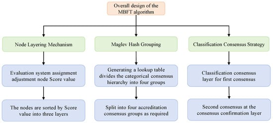 The MBFT consensus algorithm in the intellectual property authentication scenario consists of three parts: the node layering mechanism, Maglev hash grouping, and classification consensus strategy. The layering mechanism divides the nodes into the classification consensus layer, the consensus confirmation layer, and the supervision layer, and each layer divides the work to improve the consensus efficiency. The nodes are also encouraged to maintain correct behavior to ensure consensus accuracy. The Maglev algorithm divides the nodes of the classification consensus layer into four groups by generating a lookup table. The grouping results can be quickly obtained by a lookup table operation with time complexity O (1), while the property of consistent hashing is used to ensure a balanced distribution of nodes in each group. In the classification consensus strategy, in order to improve consensus efficiency, according to the type of intellectual property authentication, the four groups of nodes in the categorized consensus layer are divided into four consensus groups, which are required for intellectual property authentication, and each authentication consensus group verifies the corresponding type of intellectual property authentication request initiated by the client, and each authentication consensus group works independently in parallel. The overall design of the MBFT algorithm is shown in Figure 1.