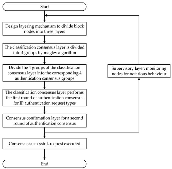 The classification consensus layer carries out the first round of authentication consensus for the IP authentication request sent by the client. Upon successful consensus, the consensus confirmation layer proceeds with a second round of authentication consensus to validate the accuracy of the consensus result. The role of the supervision layer is to prevent the Byzantine nodes from generating evil behaviors when performing consensus; when it is found that the information sent by a consensus node is different from that sent by other consensus nodes, it can be determined that the node is a malicious node, and evidence, i is sent to the nodes of the other layers, where evidence is the evidence of the node’s evil behavior, and i is the node’s label number. After collecting more than half of the votes, the supervisory node reduces the Score value of the node and restricts it from acting as a master node. If the Score value of a node drops to 0 twice, it kicks the node out. The supervisory layer nodes do not participate in consensus voting to ensure fairness but must maintain the consensus result.