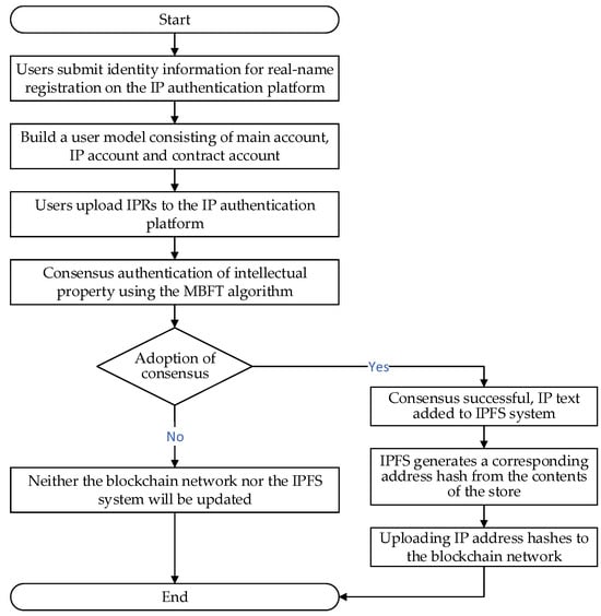 The process of IP authentication is depicted in Figure 3. The user uploads the intellectual property certificate to the intellectual property authentication platform, and the content of the certificate contains detailed information such as the specific intellectual property typology, the name of the intellectual property, the timestamp, etc. The MBFT algorithm carries out a consensus on intellectual property. If the consensus is successful, the blockchain consensus mechanism is responsible for storing the intellectual property authentication information in the blockchain ledger for the notarization of the whole network. The certificate file and the IP authentication information are stored in IPFS, which generates the corresponding address hash from the stored content and stores the hash and user information in the blockchain.
