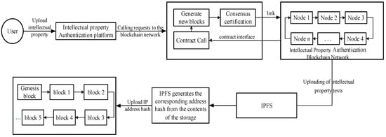 In recent years, blockchain technology has been widely regarded as a potential technical solution for reconstructing the intellectual property certification system due to its decentralization, tamperability, openness, and transparency []. By storing intellectual property data on the chain through the blockchain ledger, the security and traceability of property rights data can be effectively guaranteed so that the subject of property rights can no longer rely on third-party organizations to complete the original proof of ownership and the process of defending rights. In addition, infringement acts can be permanently recorded on the chain and shared across the network, thus increasing the cost of infringement and realizing a strong deterrent effect.