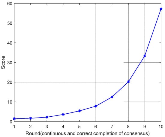 The growth trend of the Score value of a node for n consecutive rounds of correct participation in consensus is shown in Figure 5. From the figure, it can be seen that as the number of consecutive rounds of correct participation of nodes in consensus increases, the Score value of nodes also grows faster and faster. And the more the number of consecutive correct participations of a node in a consensus round, the higher the growth rate of its corresponding Score value. By assigning higher Score values to nodes that operate correctly consecutively, the system is able to encourage nodes to maintain correct behavior. For IP authentication systems, ensuring that nodes perform consensus operations accurately and correctly is critical to the reliability of the system. This mechanism can encourage nodes to maintain stability and consistency, which is conducive to the security and stability of the authentication system. Through this incentive mechanism, nodes can be inclined to actively participate in each round of consensus. Especially for Byzantine fault-tolerant scenarios, by increasing the reward for correct participation, it can increase the nodes’ willingness to participate and reduce malicious behavior. Since the Score value only increases by 1 when a node does not participate consecutively, even if a node makes an occasional mistake, it can still make up the score through subsequent consecutive participation. This provides nodes with a certain amount of fault-tolerant space, which makes the consensus system still work properly when a few nodes make mistakes.