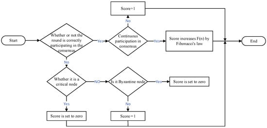 All nodes in the consensus confirmation layer, the supervisory layer, and the leader node in the categorical consensus layer are critical nodes, and the remaining nodes are regular nodes. For nodes that cannot participate in consensus stably and continuously, the probability of becoming a key node should be reduced to ensure the system’s activity. For the node that does not correctly participate in the consensus, the Score value is directly reduced to 0 if the node is a key node. If the node is an ordinary node, the node is evaluated to determine if it is a Byzantine node. If identified as a Byzantine node, the Score value is directly placed at 0. If the node fails to participate in the consensus correctly in the current round due to network and other reasons and is not judged to be a Byzantine node, the Score value is reduced by 1. The scoring logic of the evaluation system is shown in Figure 6.