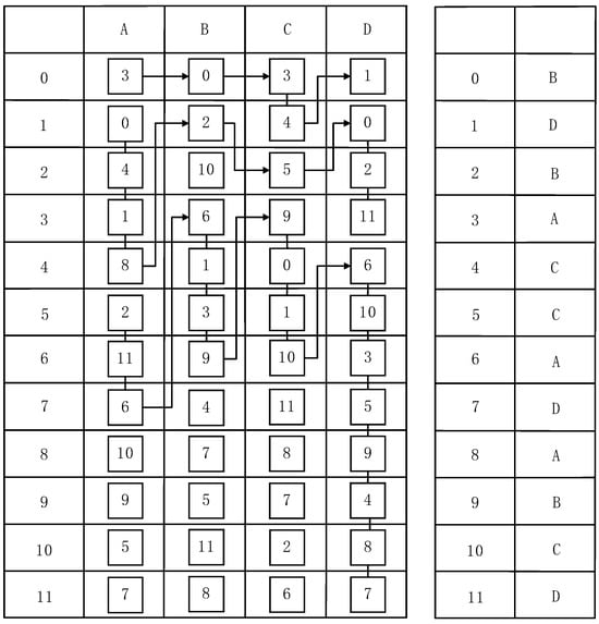 The particular grouping process is depicted in Figure 7. Twelve nodes are distributed among four groups; firstly, the first position in the sequence of group A corresponds to an empty position in the lookup table and is identified as 3, so node 3 is assigned to group A; group B is the same as above; group C, because position 3 in the lookup table is occupied, looks for the position that is not yet occupied in accordance with the sequence, position 4, so node 4 is assigned to group C; and node 1 is assigned to group B. After assigning a node to each group, the second round is started until the nodes are assigned. After one node is assigned to each group, the second round is started until the nodes are assigned. Through the above process, it can be found that only the time complexity O (1) lookup table can obtain the grouping results, and the nature of the consistency hash can also ensure the balance of the grouping.