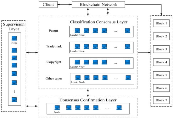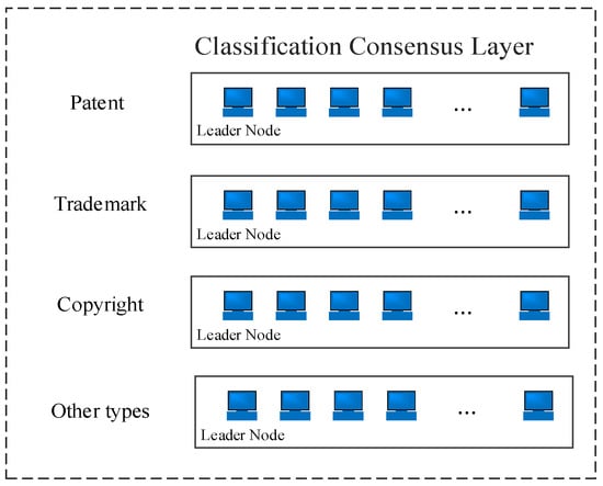 In the scenario of intellectual property authentication with n nodes, the nodes are ranked according to their Score value. Among the nodes with Score value ranked in the top n/3, the nodes with odd rankings are assigned to the consensus confirmation layer, the ones with even rankings are assigned to the supervision layer, and the remaining 2n/3 nodes are assigned to the classification consensus layer, which guarantees the nodes’ reliability across the consensus confirmation layer and the supervision layer. The leader nodes of the consensus confirmation layer and the supervision layer are the nodes with the highest Score value within the layer.
