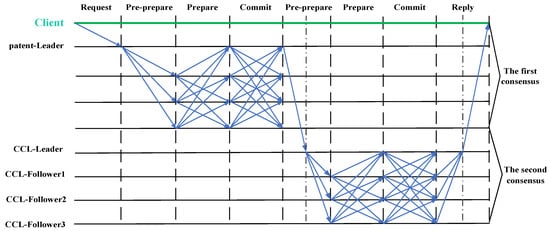 In the IPR authentication scenario, the MBFT consensus algorithm employs two consensus phases to ensure the system’s consistency and reliability. The first consensus ensures the validity of the request and coordination among nodes, and the second consensus aims to further verify and confirm the validity of the patent authentication and its final approval. Figure 10 illustrates the interaction flow of the consistency protocol for the algorithm, which clearly demonstrates the interaction and information transfer between the stages, thus guaranteeing the integrity and correctness of the whole authentication process.