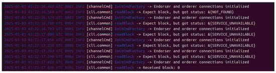 The process of joining the channel by each organization node in the Hyperledger Fabric federation chain network is shown in Figure 15. The log records show that the organization nodes (Org1Peer, Org2Peer, and Org3Peer) sequentially perform the channel join operation, including initializing the connection (InitCmdFactory) of the Endorser node (Endorser) and the Orderer node (Orderer) and successfully submitting the proposal to join the channel (executeJoin). From the timestamp information, the joining process of each node was completed within 0–1 s without any exception or error. After the nodes join the channel, consensus processing can be performed in that channel.