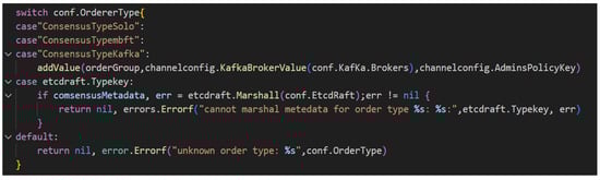 In the Fabric Alliance Chain open-source framework, the scalable consensus algorithm is supported. The implementation code of the consensus algorithm is placed in the fabrics/fabric/consensus directory, and its configuration information is added to the fabrics/fabric/consensus/consensus.json file. The corresponding image file will be generated after compiling the source code. The MBFT algorithm configuration is shown in Figure 14.
