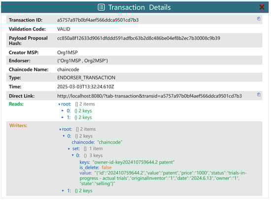 On the IPR authentication page, users are required to fill in relevant information and click on registration according to the prompts. After the authentication request is submitted to the consensus node by the client, the MBFT algorithm is triggered for consensus processing. If consensus is reached, the authentication information will be written into the blockchain ledger. Users can query the underlying block data and view the latest completed IPR certification through the blockchain browser, as shown in Figure 16.