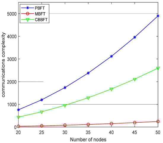 In trademark right authentication consensus, the experiment is conducted with the number of nodes as the independent variable. The experiments set the number of nodes as 20, 25, 30, 35, 40, 45, and 50 and kept the number of consensus nodes in MBFT, CBBFT, and PBFT consistent. The effect of the change in the number of nodes on the communication complexity of the three algorithms in the process of trademark right authentication is analyzed, and the final experimental results are presented in Figure 17.